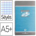Couverture en carton contrecollé de 1,5 mm d'épaisseur, recouvert sur une face de papier couché mat avec détails en RELIEF 135 g/m². Couverture intérieure imprimée. Papier de 90 g/m² avec bandes de 5 couleurs. 240 pages. Microperforé. Spirale nylonisée de couleur. Coil-lock. Réglure 5 x 5.