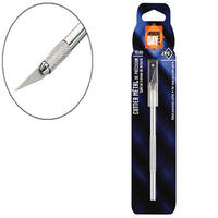 Cutter avec frein de sécurité. Lame en acier précoupé. Présentation dans une pochette pp. Largeur de la lame : 9 mm. Longueur : 140 mm.