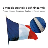 Le drapeau est une pièce d'étoffe (pavois) qui est fixée avec des clous dorés sur une hampe en bois, bleue, surmontée d'une lance PVC en relief.